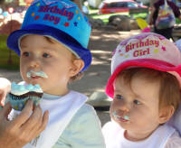 at their first birthday party, are the twin son and daughter of Carolyn & Joe Higgins, the grand son and daughter of Ed & Kay Zacharski and the great grand son and daughter of John & Irene Zacharski